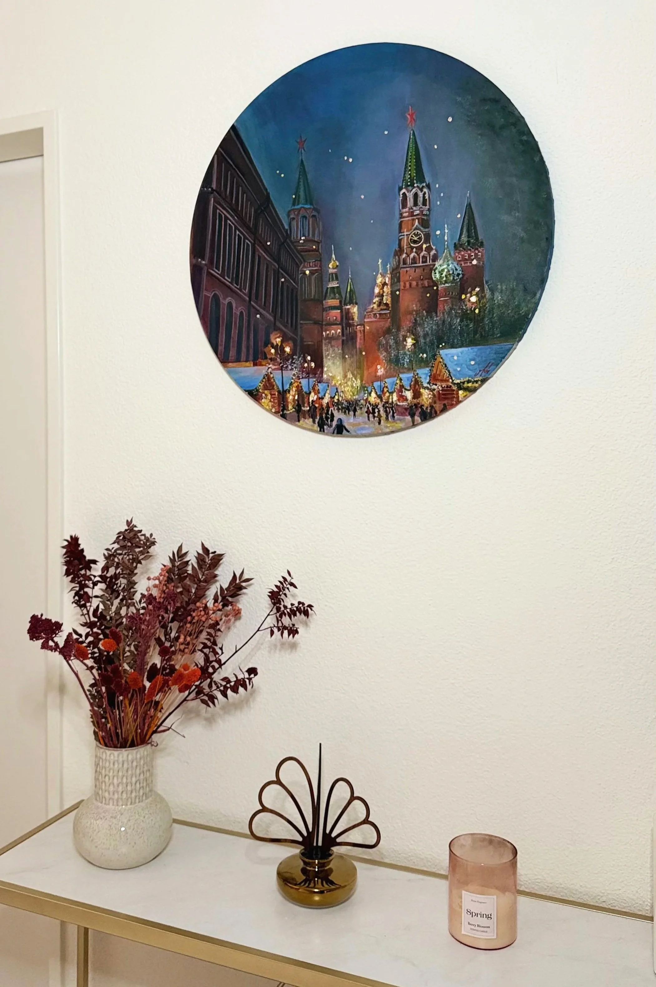 Inspired by a snow globe, this round painting shows Moscow's Red Square on a winter evening. The circular format makes you feel like you are looking into a magical sphere where snow gently falls over the festive scene.