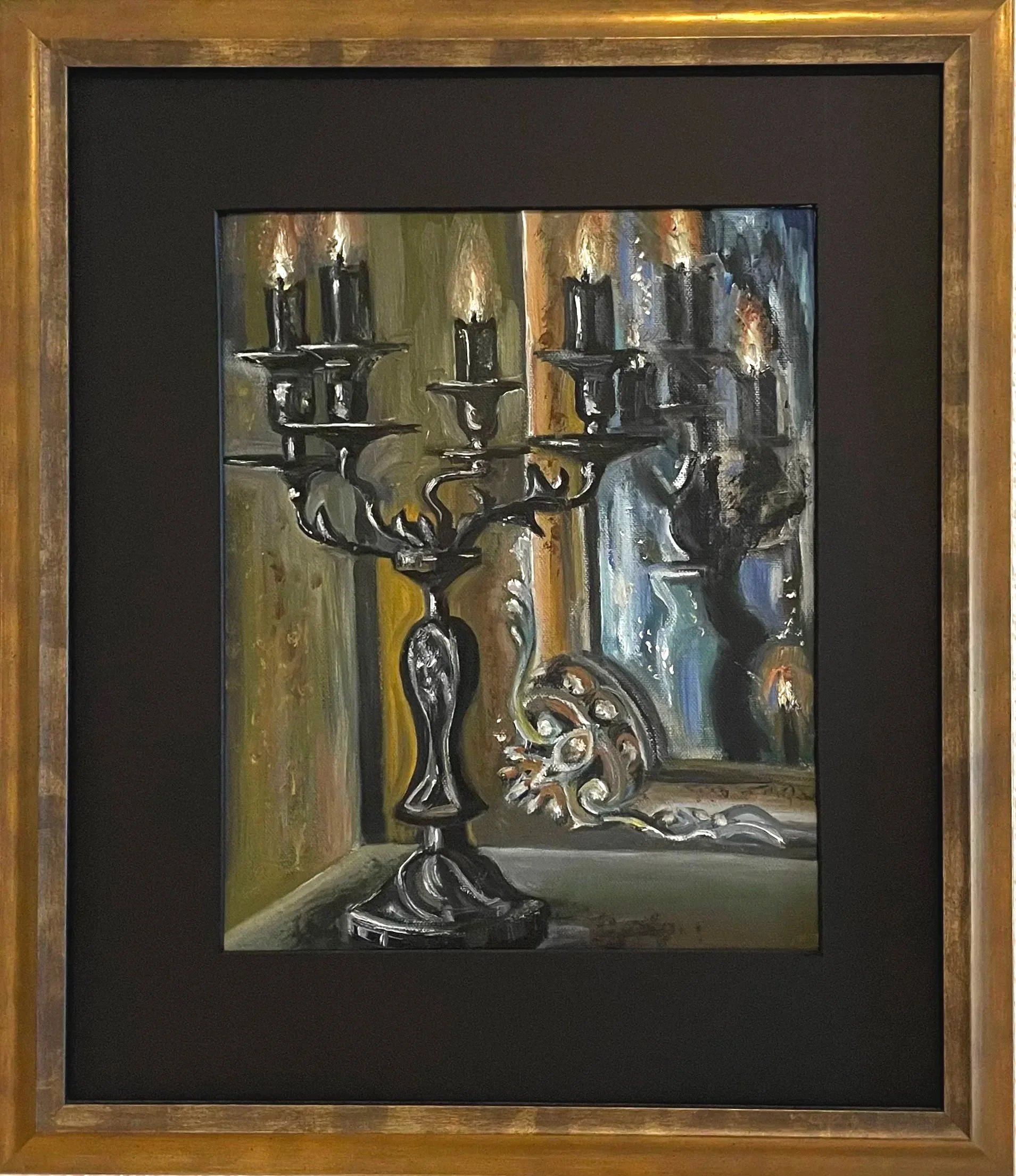 This painting captures ornate candelabras with gentle flames dancing in quiet atmosphere. I deliberately played with the slightly distorted forms of the candlesticks - these imperfect shapes create their own sense of movement and energy.