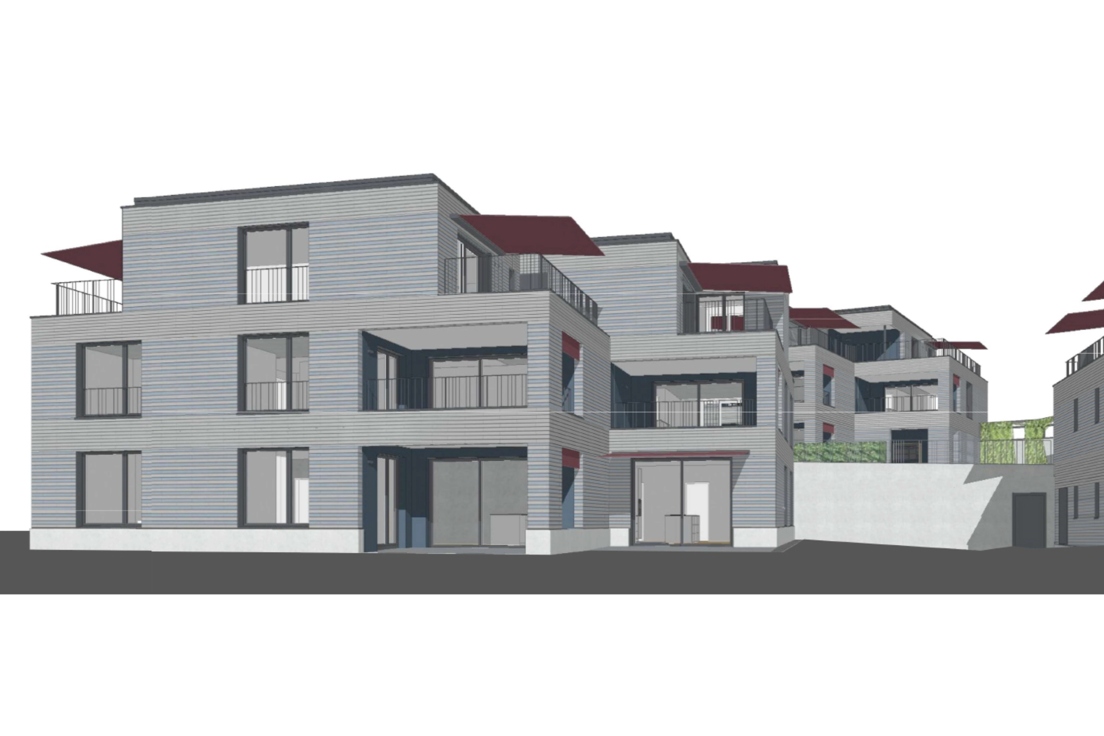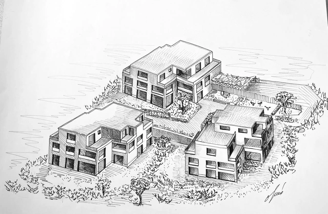 Architectural visualization for a three-building residential project currently under construction. The hand-drawn renderings help present the development concept to stakeholders and the local community.