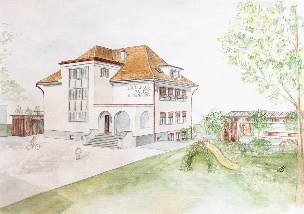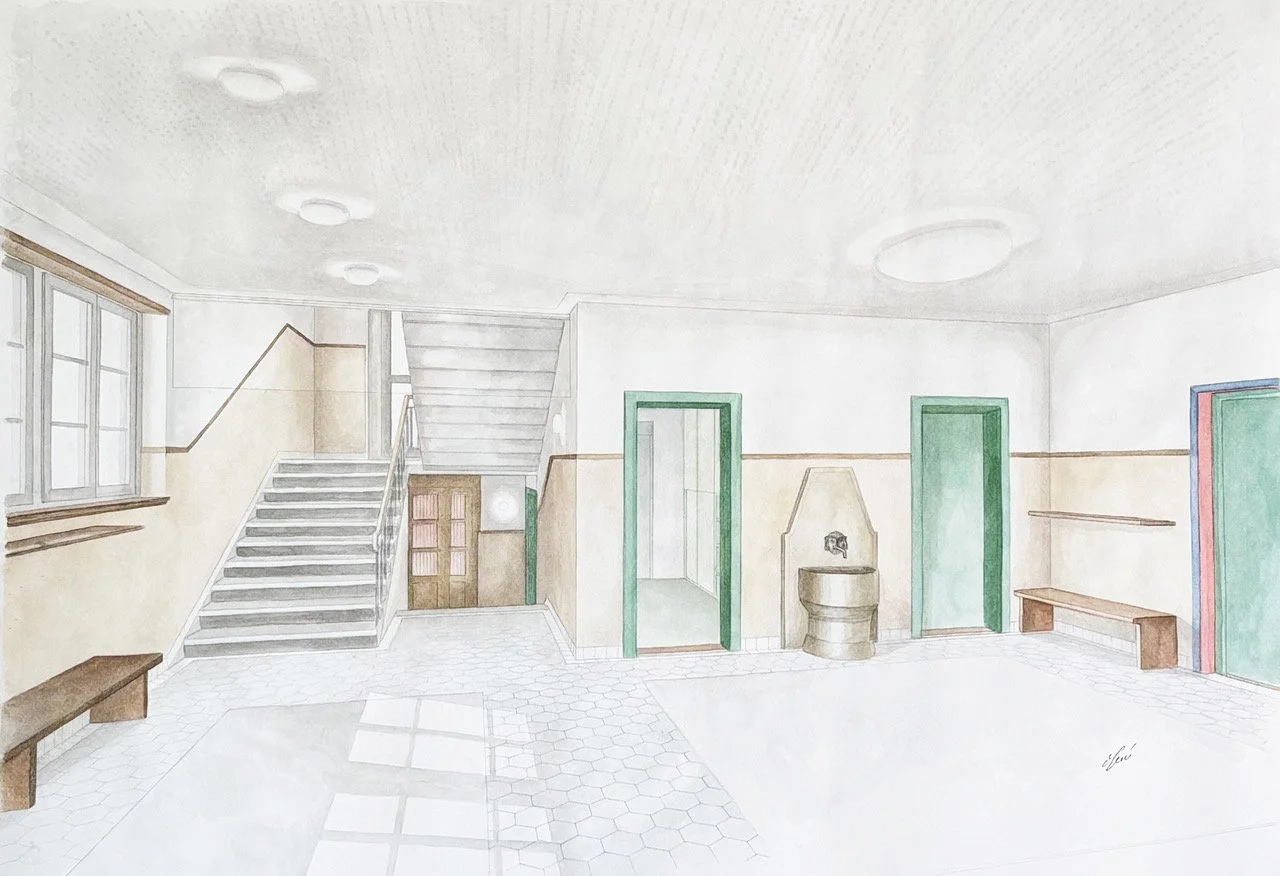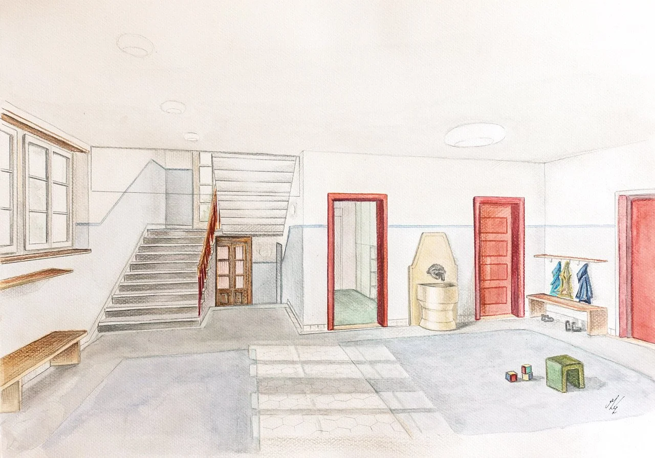 Two watercolor visualizations created for this school building project. These hand-drawn renderings capture both exterior and interior perspectives, providing a clear vision of the architectural concept.
